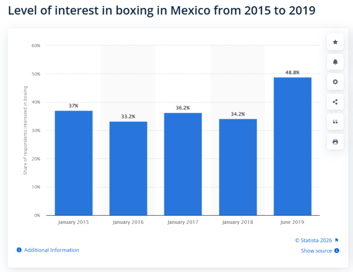 По данным Statista, 48% мексиканцев смотрят матчи, ищут о них информацию или сами занимаются боксом. Численность населения Мексики, к слову, составляет 133 млн человек. То есть бокс – просто золотая жила!