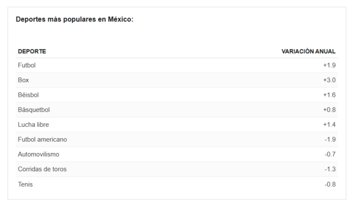 В Мексике бокс тоже любят. Причем любовь становится крепче с каждым днем. Monday Night Football сообщает: ежегодное увеличение спроса на боксерские поединки составляет +3%, тогда как, для примера, интерес к классическому футболу возрастает лишь на 1,9% (а к корриде и вовсе падает).
