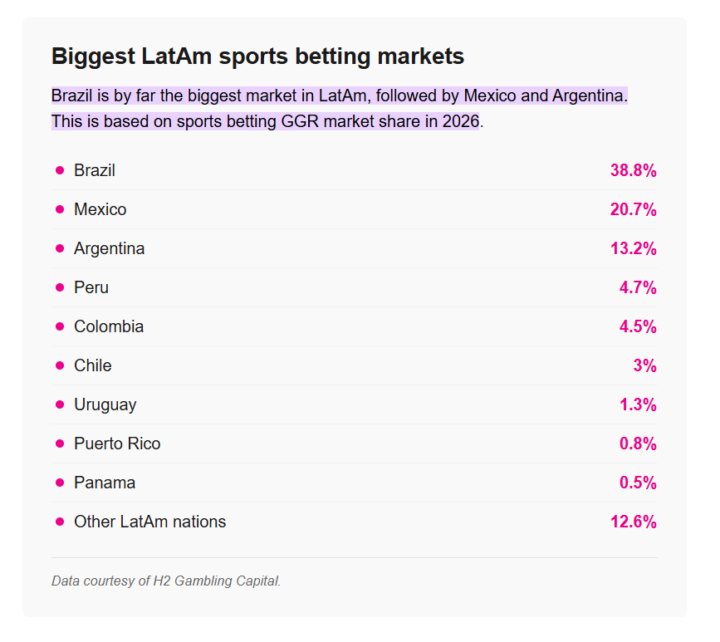 Во многом такой уровень вовлеченности объясняется наследием «Золотого поколения» (Generación Dorada), которое выиграло золото Олимпиады-2004. В Латаме принято болеть за своих, местные гордятся своими соотечественниками (и поддерживают их как могут, в том числе через ставки). Просто посмотрите, как это работает: после того, как количество аргентинских игроков в NBA увеличилось, подписки на NBA League Pass в Аргентине выросли на 95% и вывели страну на 9-е место в мире! И это при том, что Аргентина – даже не на первом месте в списке. Согласно данным H2 Gambling Capital, Бразилия остается крупнейшим беттинг-рынком Латинской Америки, за ней следует Мексика, а Аргентина замыкает тройку лидеров.